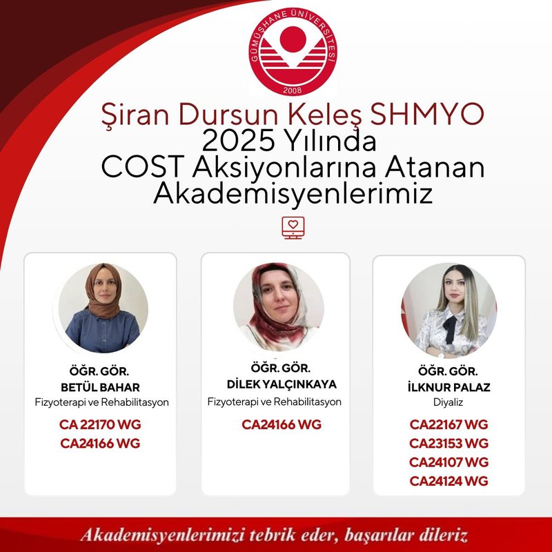 Gümüşhane Üniversitesi Şiran Dursun Keleş Sağlık Hizmetleri Meslek Yüksekokulu akademisyenleri, 2025 yılı itibarıyla farklı COST Aksiyonlarında çalışma gruplarına atanarak uluslararası araştırma ağlarında görev almaya hak kazandı.
