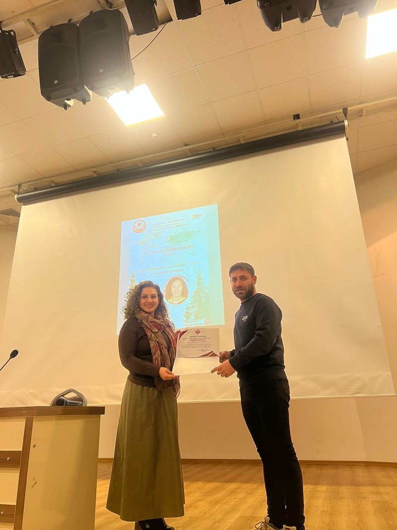 Sunumun ardından, Şiran Dursun Keleş Sağlık Hizmetleri Meslek Yüksekokulu Öğretim Görevlisi Emre Sarı, Doç. Dr. Neva Doğan’a katkılarından dolayı teşekkür belgesi takdim etti.